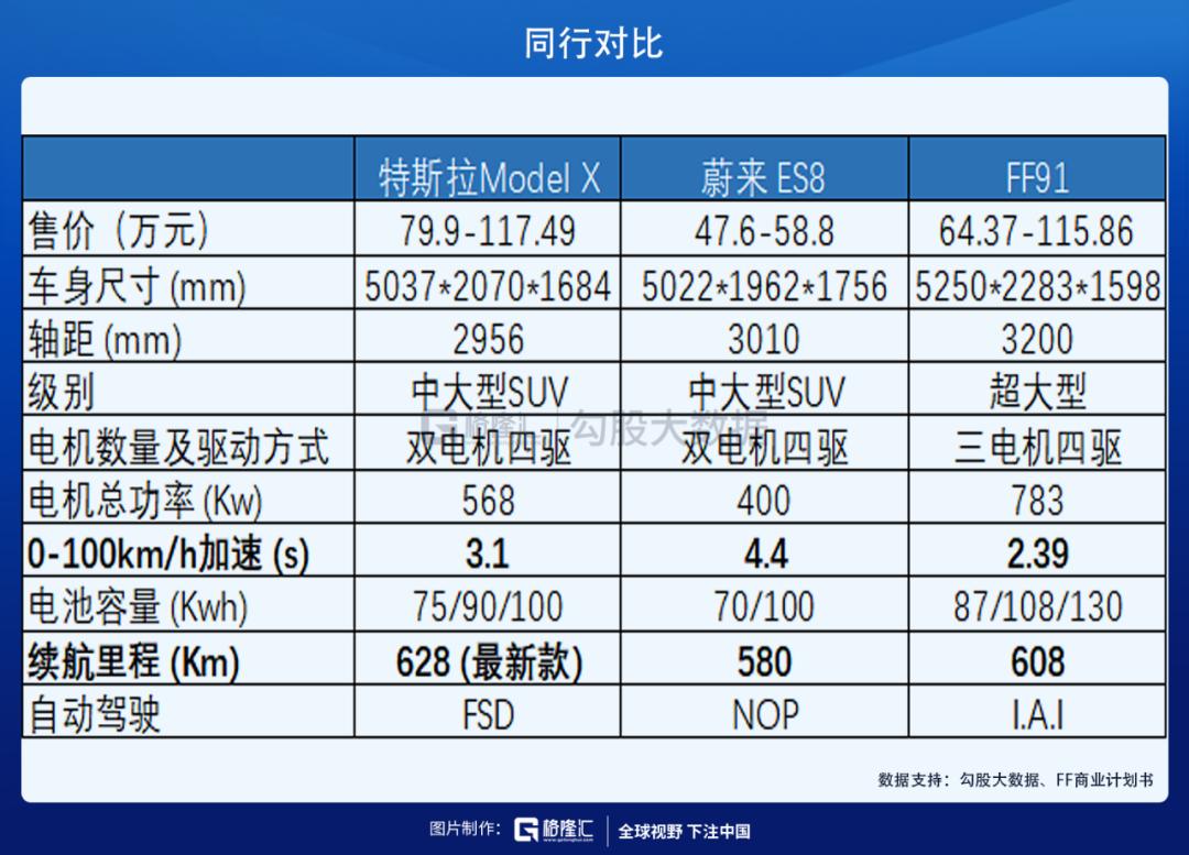 三电系统上,2.39秒的零百加速和608 Km的续航对标特斯拉Model X和蔚来ES8,配上加上783Kw的高功率电机和1050匹马力,早在2017年FF91用时11分25.83秒跑完12.42英里爬坡赛道,成为派克峰爬坡赛最快EV,刷新了Model S纪录。25分钟完成从20%到80%的电池充电,远超蔚来ES8的60分钟,仅比Model S的24分钟多一分钟。