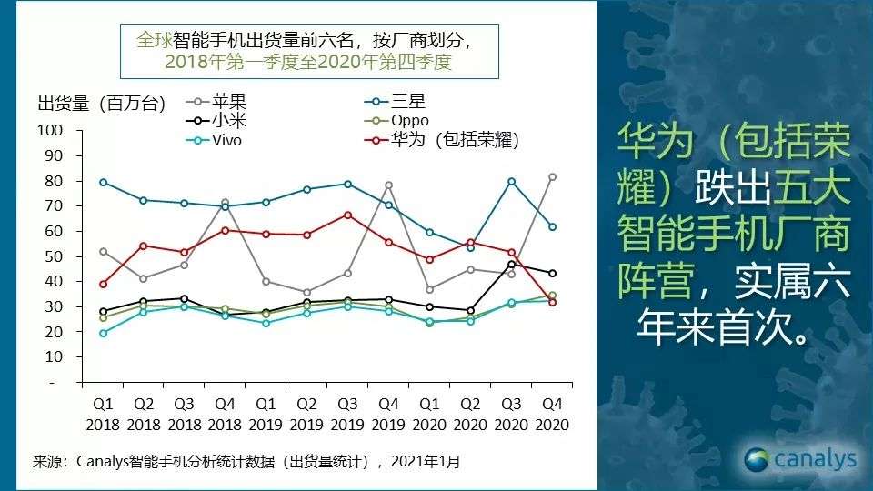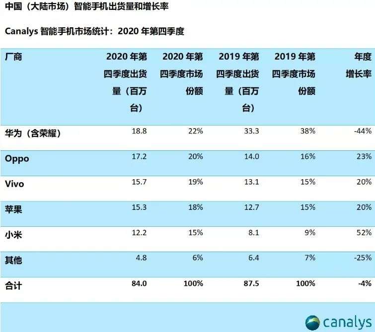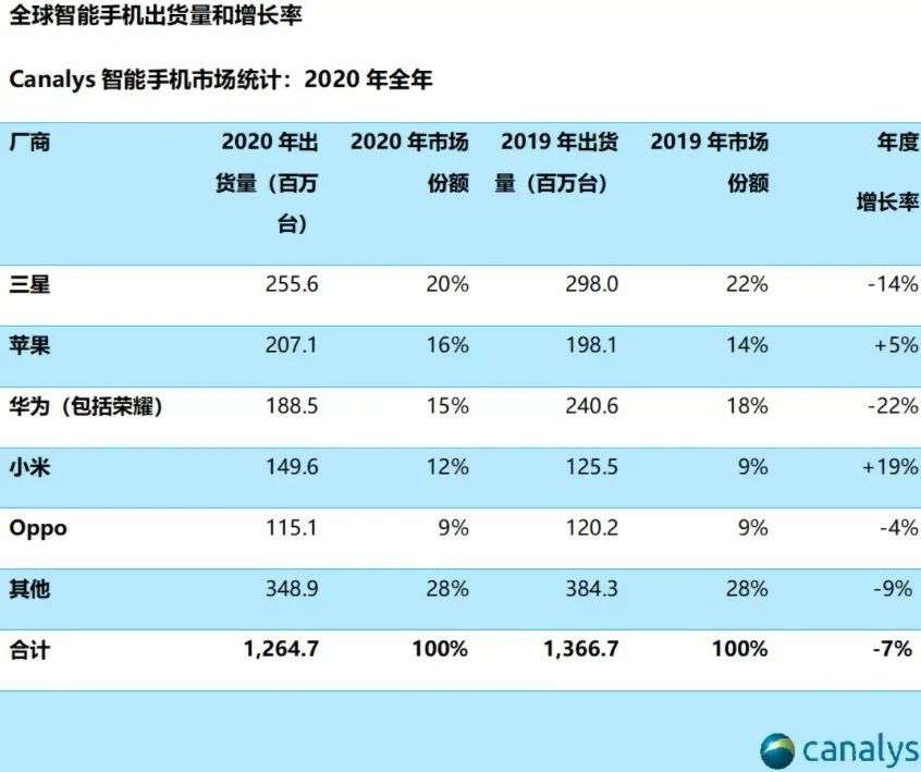 除了销量重返全球第一的苹果,小米也在默默发力——Canalys数据显示,2020年全年,全球前五大手机厂商,只有苹果和小米获得正增长,且小米增长幅度高于苹果。