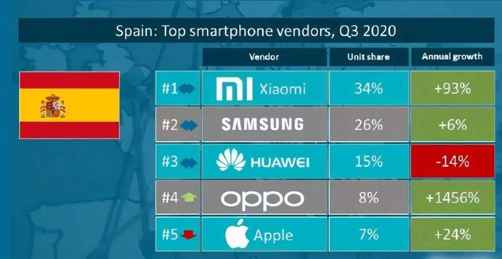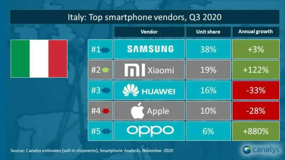 Canalys数据统计,2020年第三季度,OPPO在西欧市场出货量同比增长942%,市占率4%,已经上升到第五位;而在整个欧洲市场,OPPO当季出货量也同比增长了396%,市占率为3%,同样排在第五位。