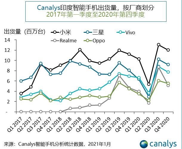 Canalys数据显示,2020年第三季度,小米手机在印度出货1310万台,同比增长9%;第四季度出货1200万台,同比增长7%。