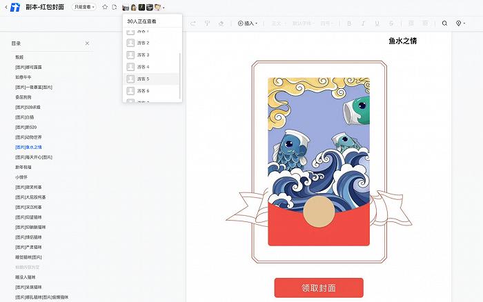 夜里11点,在这个贴满劣质图片的共享文档里,还显示有32个人在“福牛迎春”、“机车男”、“夜光猫咪”等图片包中挑选着。每个封面的价格10元-30元不等,选中付款后会收到一串可兑换封面的序列码,有效期三个月。