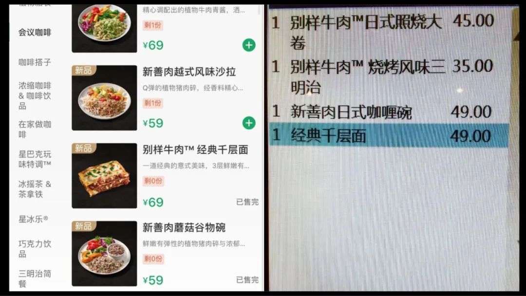 “低脂健康,反响还不错!”忙碌在咖啡机左右的星巴克店员表示,只要有顾客伫足在烘焙展示柜前犹豫不决选品时,她大概率会向顾客介绍几款在售的植物肉产品,例如“别样牛肉青酱意面”和“别样牛肉经典千层面”。而这些产品也可以在啡快和星专送、外卖跑腿平台上下单。