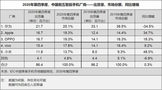 据IDC的报告显示,华为手机2020年Q4季度全球市场中排名第五。而市场调研机构Omdia发布的数据显示,2020年全球智能手机出货量达12.9亿部,较上年13.8亿部出货量同比下降6.7%,华为在2020年第四季度已跌出Top 5。无论是第五,还是五名开外,都证实了华为手机的下滑的事实。2020全年,华为手机出货量下降了21.6%,由2019年的2.4亿部跌至1.88亿部。