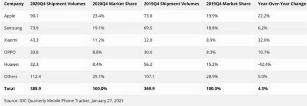 据IDC公布的《2020年第四季度全球手机销量调研报告》显示:苹果在2020年第四季度全球手机出货量达9010万台,占世界手机出货总额的23.4%,位居榜首;其次为出货量7390万台的三星,市场份额约为19.1%;小米也有4330万台的出货量,份额达11.2%;OPPO出货量为3380万台,约占8.8%的市场份额。