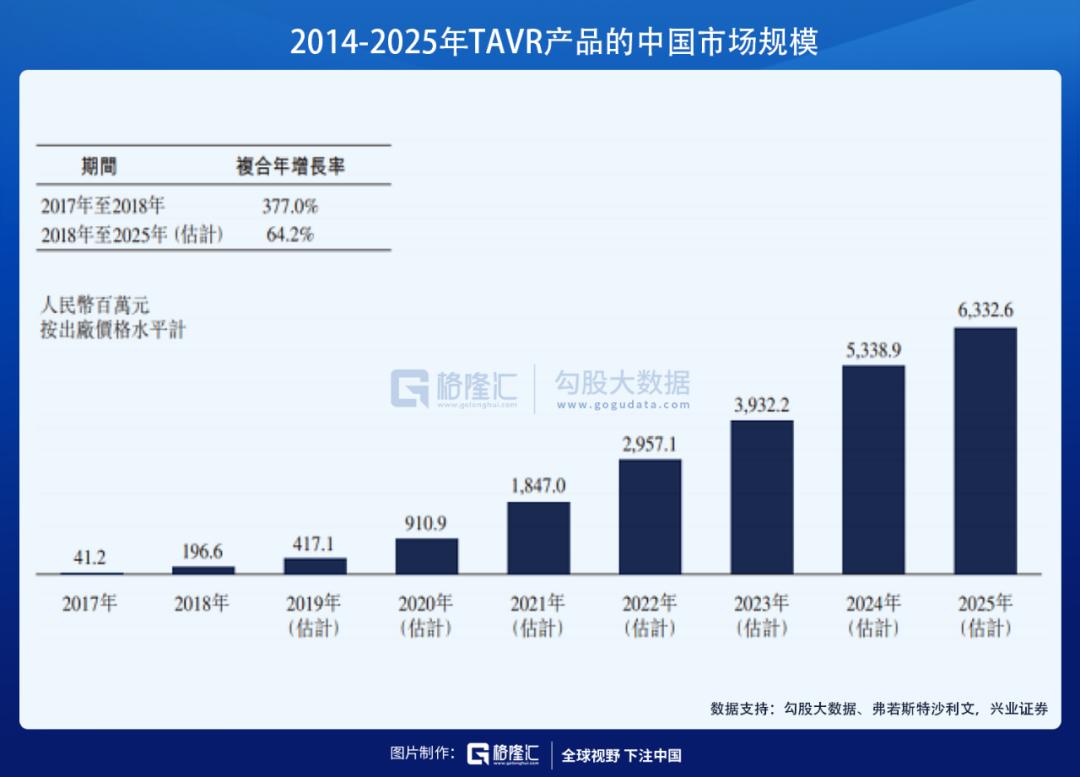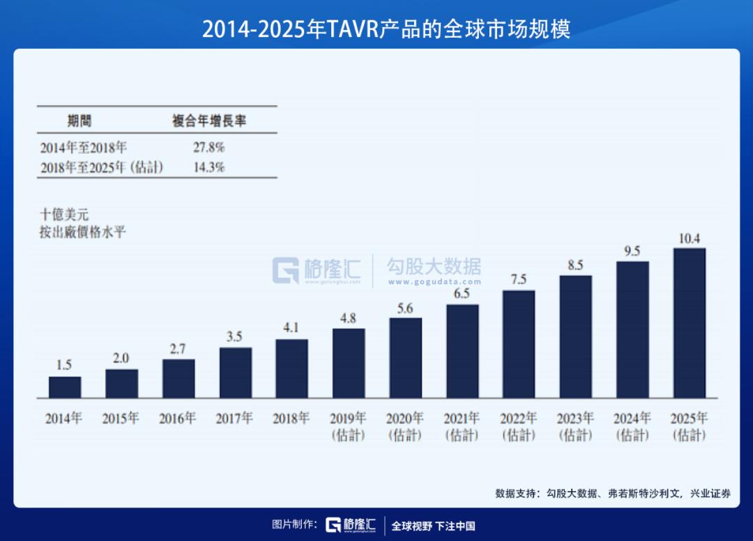 全球TAVR产品市场由2014年的15亿美元增至2018年的41亿美元,复合年增长率为27.8%,且预期将进一步增至2025年的104亿美元,2018年至2025年的复合年增长率为14.3%。