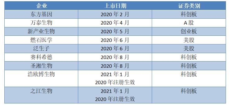 与此同时,IPO抢滩潮顺势展开,2020年共有7家分子诊断技术企业敲钟上市,另有2家企业注册生效在今年1月登陆股市。