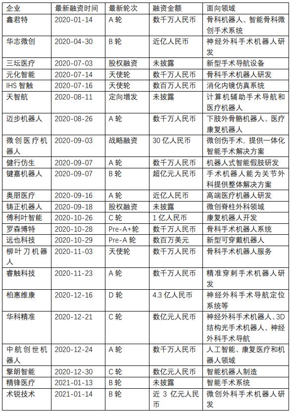2020年,手术机器人成为热门领域,微创医疗高调入局手术机器人,旗下微创医疗机器人宣布完成30亿元的战略融资,引入了包括高瓴资本、CPE、贝霖资本、远翼投资、易方达资本在内的多家知名战略投资者,成为国内整个机器人行业2020年规模最大的融资事件。值得注意的是,除了主流的腹腔镜手术机器人,微创医疗还将业务扩展到了骨科手术机器人、肺部活检机器人等领域。