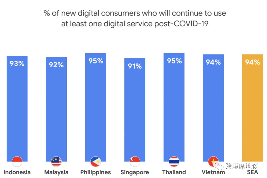 同时,2020年东南亚地区互联网用户新增了4000万,达到4亿,流量红利明显。95%的新增用户表示在疫情后也会继续使用互联网服务。90%以上的东南亚受访者认为疫情影响下对在线服务的需求将持续。