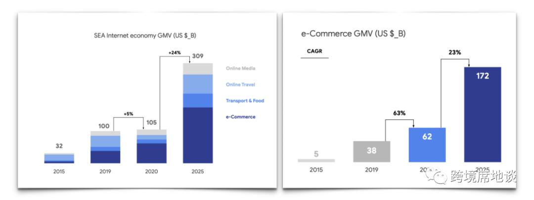 淡马锡、Google 和 Bain 预测在2020年针对东南亚市场的报告中预测,2025年东南亚电子商务市场将达到1720亿美元,即未来以每年23%的速度增长。