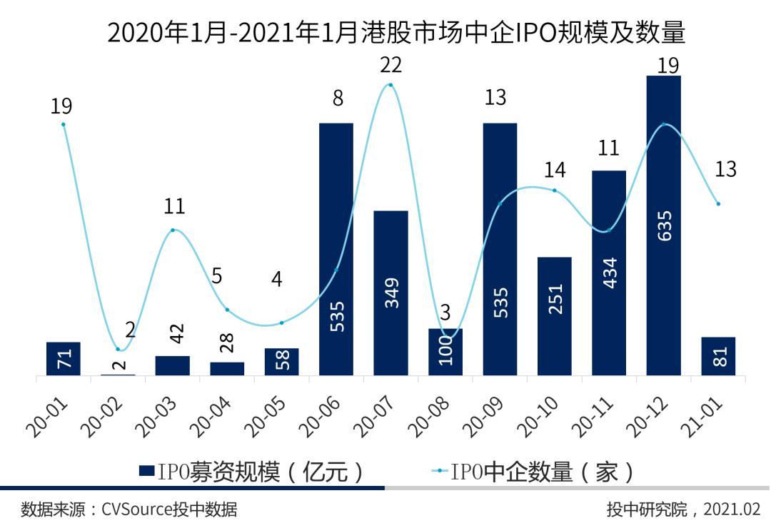 图4 2020年1月-2021年1月港股市场中企IPO规模及数量