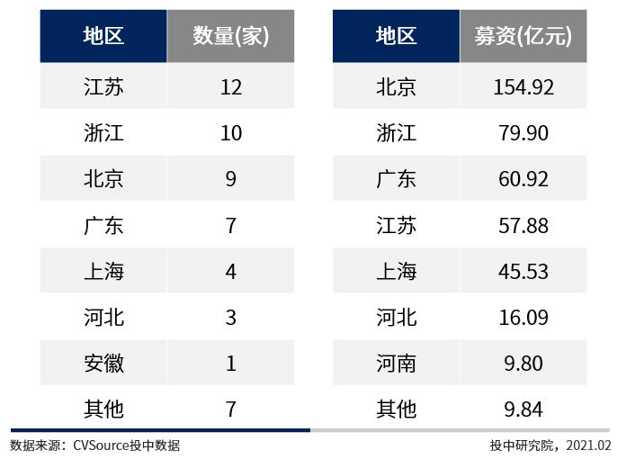 2021年1月,江苏地区中企IPO数量为12家,IPO数量位于榜首,浙江、北京紧随其后;北京地区中企IPO规模达154.92亿元,位居首位,浙江、广东分别排名第二和第三。(见图8、表7)