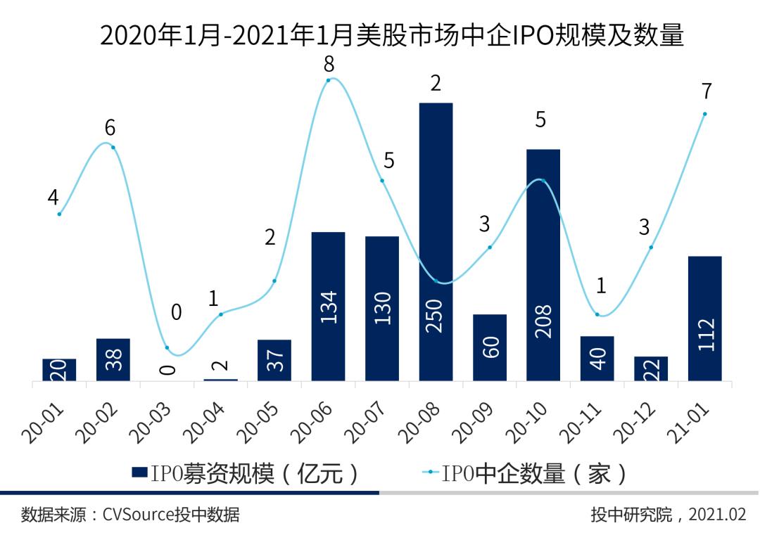 图5 2020年1月-2021年1月美股市场中企IPO规模及数量