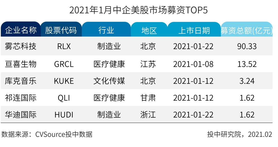 表4 2021年1月中企美股市场募资TOP5