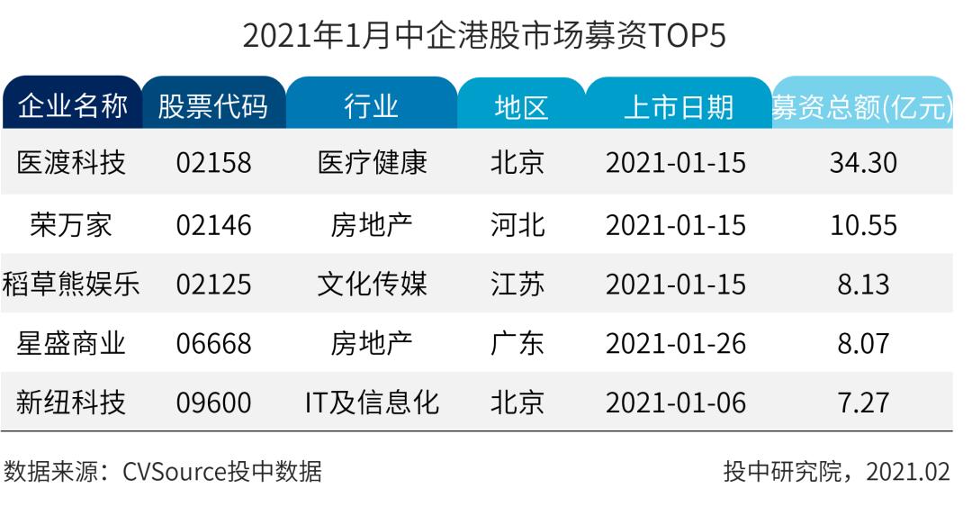 表3 2021年1月中企港股市场募资TOP5