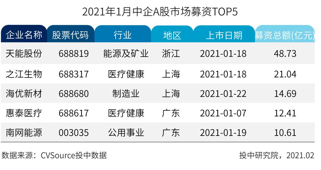 表2 2021年1月中企A股市场募资TOP5