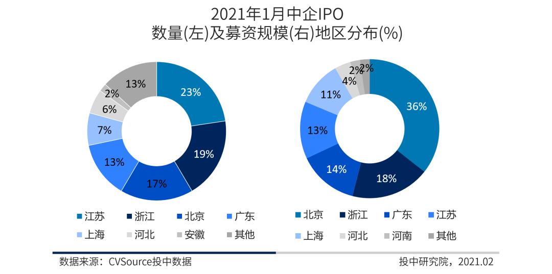 图8 2021年1月中企IPO数量及募资规模地区分布,注:IPO数量分布比例(左)以及规模比例(右)相加总和均不为“1”系四舍五入所致