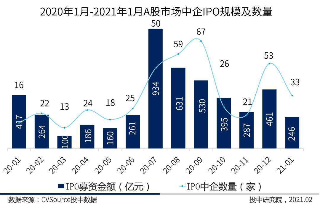 图3 2020年1月-2021年1月A股市场中企IPO规模及数量