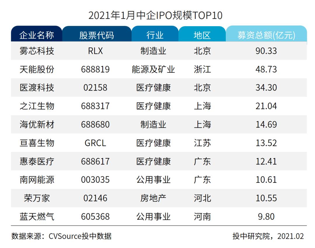 表8 2021年1月中企IPO规模TOP10