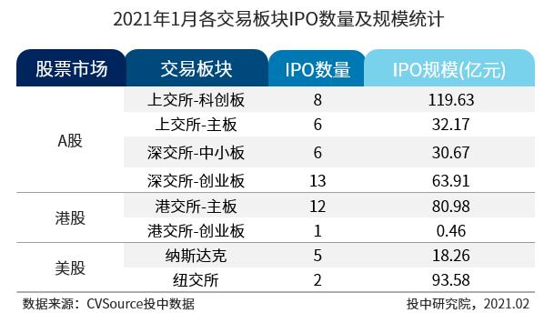 表1 2021年1月各交易板块IPO数量及规模统计