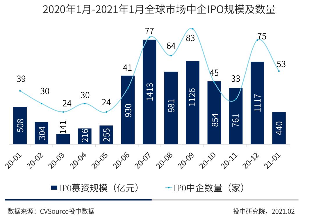 图2 2020年1月-2021年1月全球市场中企IPO规模及数量