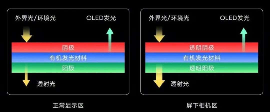 屏幕中的像素点、阴极、阳极和电路等部分都会明显降低透光率,而想要保证良好的成像效果,屏幕的透光率就必须在90%以上。