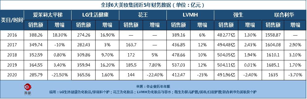不过,总体来看,雅诗兰黛在2020年全年销售额同比上一年缩水了近113亿元。青眼梳理发现,爱茉莉太平洋、LVMH、LG生活健康等已公开发布财报数据的几家美妆集团,均呈现出近5年来最差的销售表现。