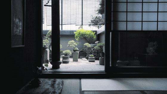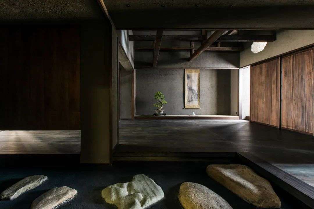 他把传统宋式寺庙的木梁架搬到了家里,又从深山搬来10块五、六百斤重的大石头,庭院里放满了雅雅的盆景,在公寓里做出了隐居深山的感觉。