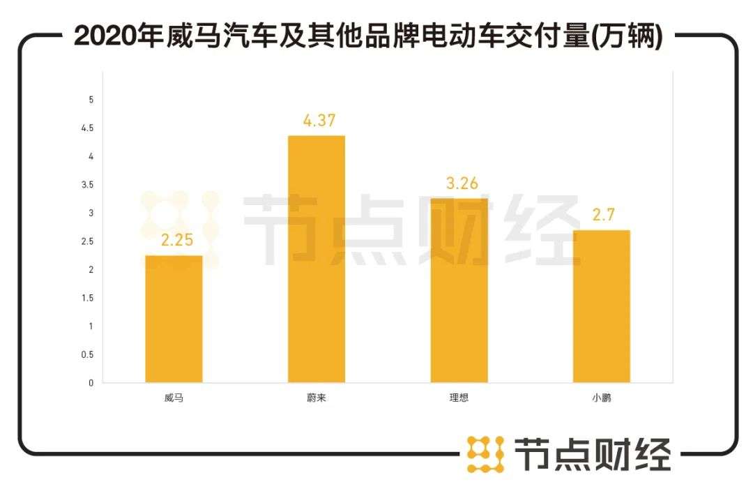 但转眼到了2020年,在全年累计销售量上,威马汽车并没有守住前三名的位置,滑到了第四位,销量为2.25万辆。而蔚来全年销量为4.37万辆,小鹏汽车为2.7万辆,理想赶超了威马汽车,销售了3.26万辆。
