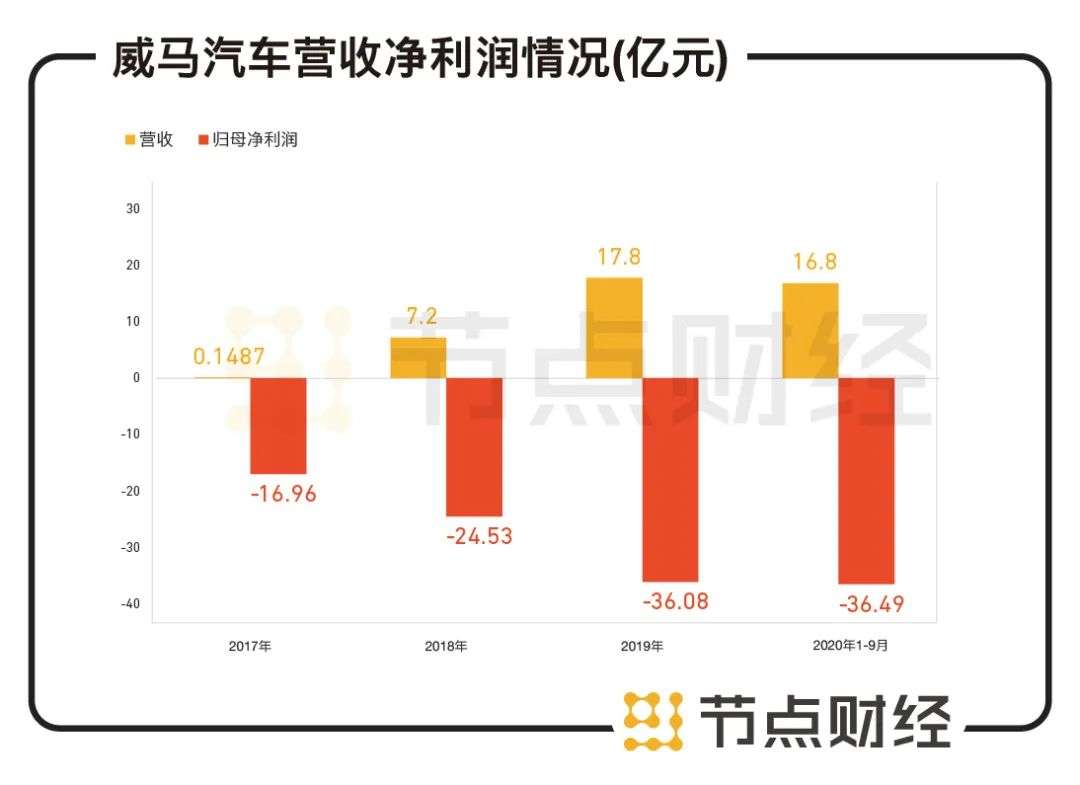 同时在净利润方面,威马汽车也低于竞争对手。威马汽车在辅导总结报告中披露,2017-2019年以及2020年1至9月,分别实现营收1487.17万元、7.2亿元、17.8亿元以及16.8亿元;分别实现归母净利润-16.96亿元、-24.53亿元、-36.08亿元以及-36.49亿元。四年亏损超百亿。