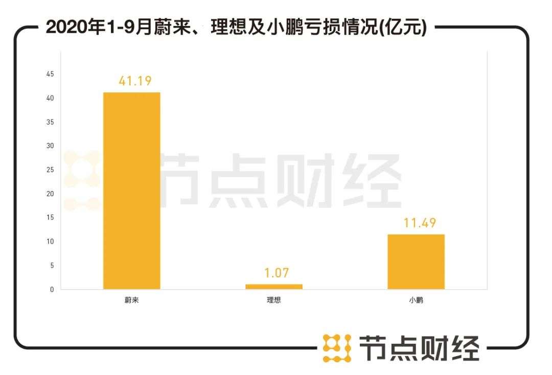 据财报数据显示,2020年1至9月,蔚来、理想、小鹏分别亏损41.19亿元、1.07亿元、11.49亿元。