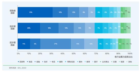 其中,互联网行业凭借超大规模互联网企业对云计算的大量投入以及对人工智能等新兴技术的提前布局,在全球计算力水平中遥遥领先。其中,作为领跑者的中美两国在此领域的算力支出占比超过了30%。