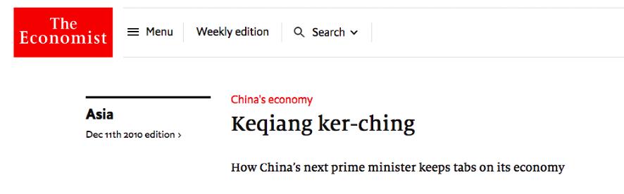 2010年末,英国《经济学人》杂志将这三项指标予以综合,创造出了一个崭新的「克强指数」。