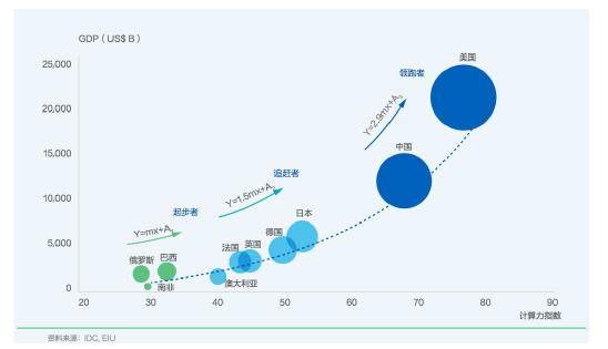为了更好地评估计算力作为生产力的作用,IDC分析了不同国家计算力指数与经济的对应关系。
