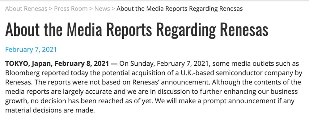 其中第一篇公告是瑞萨电子针对彭博社报道的回应,称“虽然媒体报道的内容基本准确,我们也在讨论进一步促进业务增长,但目前还没有做出决定。如有重大决定,我们将立即通知。”