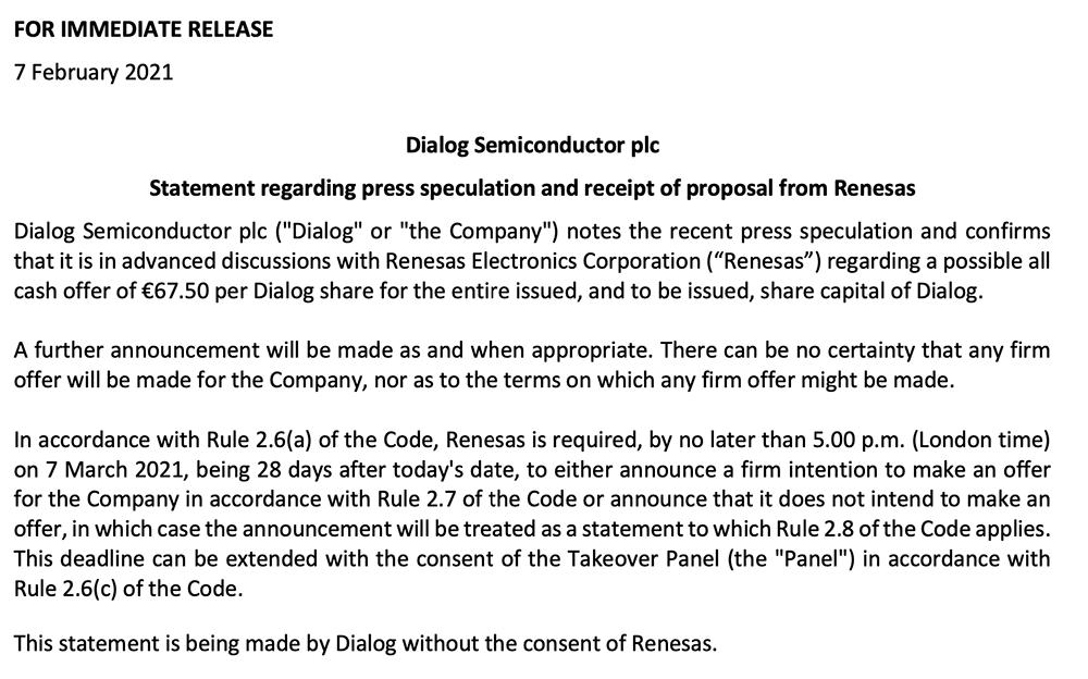 第二篇公告则是回应Dialog的声明,瑞萨电子同样确认了其正在与Dialog管理层进行高级讨论,讨论范围包括Dialog全部发行股本的现金要约价格,每股67.5欧元。