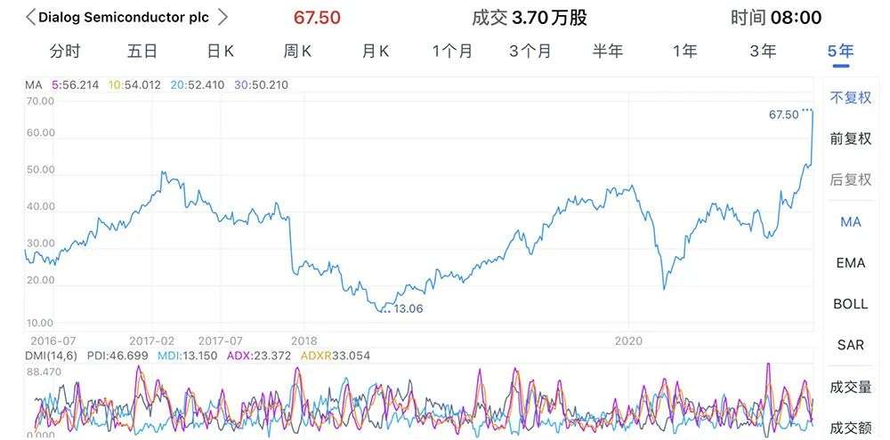 Dialog是一家在德国法兰克福上市的欧洲老牌芯片企业,主要面向消费电子领域提供混合信号芯片,包括电源管理芯片、照明芯片、蓝牙芯片、音频子系统等。
