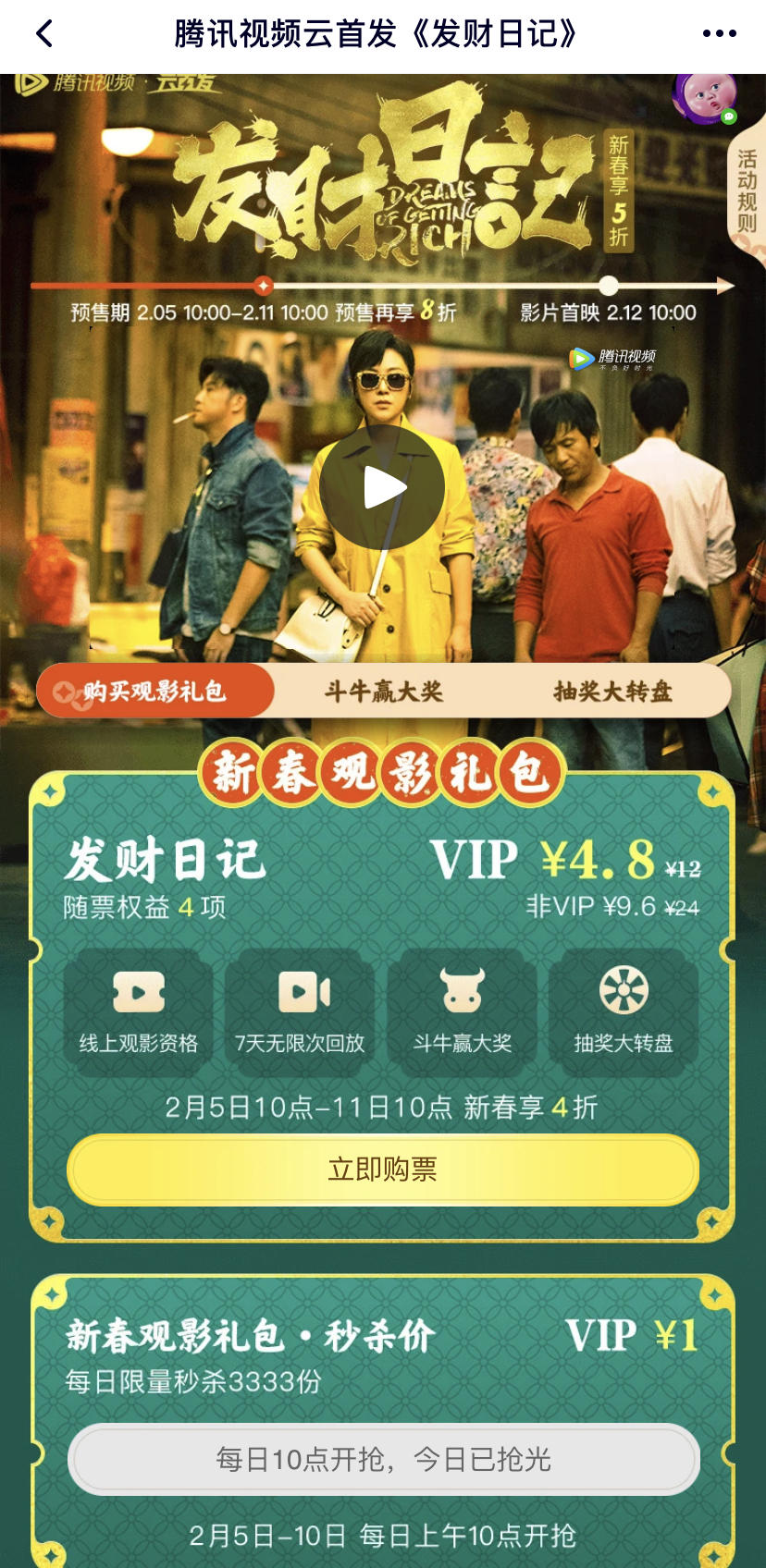 而打开腾讯视频预售页面可以看到,用户购买预售票后可获得2次斗牛赢大奖的机会和1次抽奖大转盘的机会,预售期间的每天上午10点,平台还会开启新春观影礼包秒杀活动,每日限量放出3333份,每份秒杀价1元。