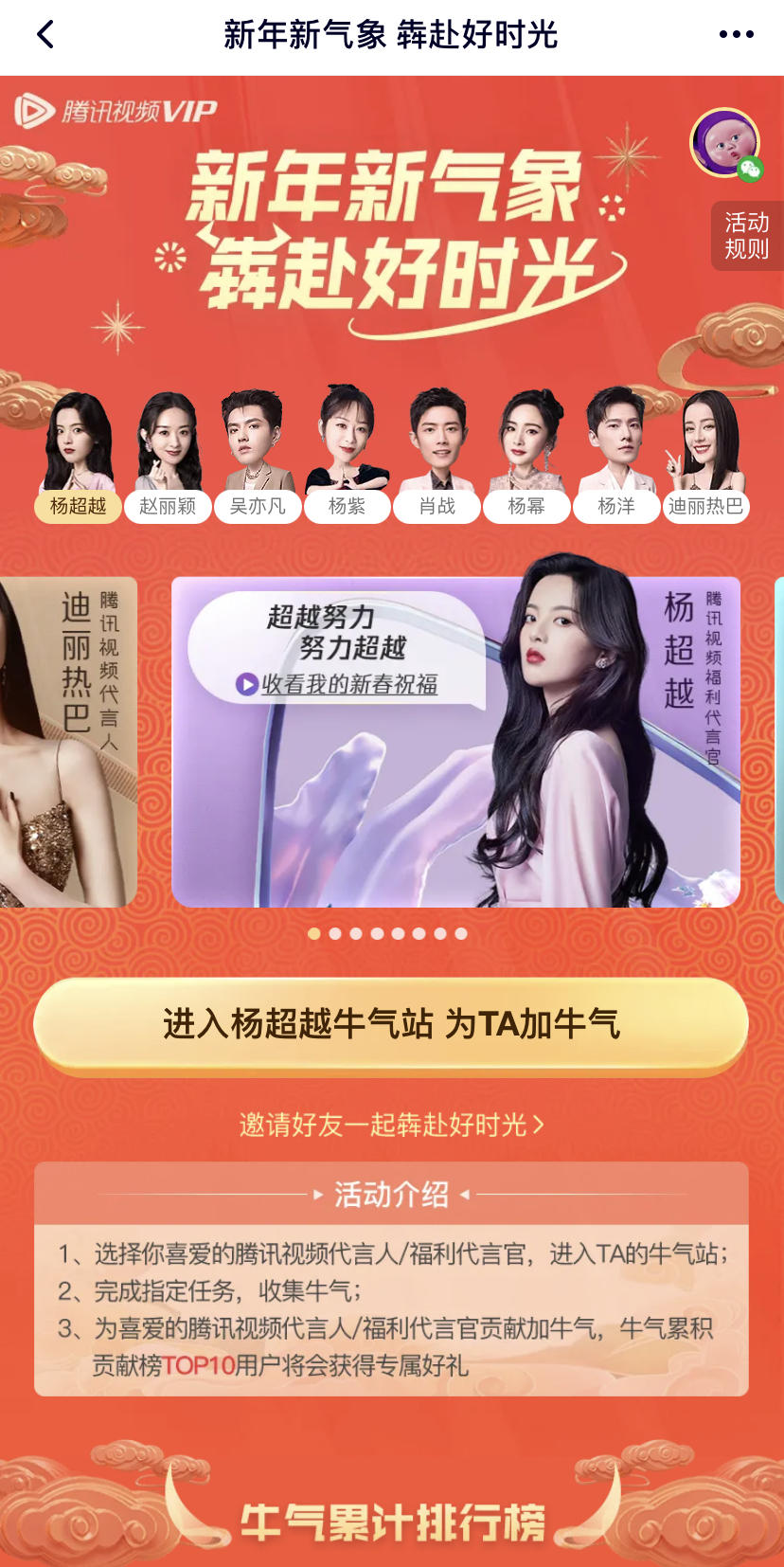2月6日,腾讯视频一口气官宣了赵丽颖、吴亦凡、杨紫、肖战、杨幂、杨洋、迪丽热巴7位代言人以及福利代言官杨超越,与此同时,腾讯视频也在“新年新气象 犇赴好时光”专区配合推出了集牛气、为代言人做海报等互动福利活动。