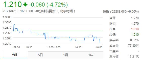 公司股价从2011年的12.85港元/股高点跌至2021年的1港元/股左右,截至2021年2月5日收盘,味千拉面报收于1.21港元/股,总市值13.21亿港元。