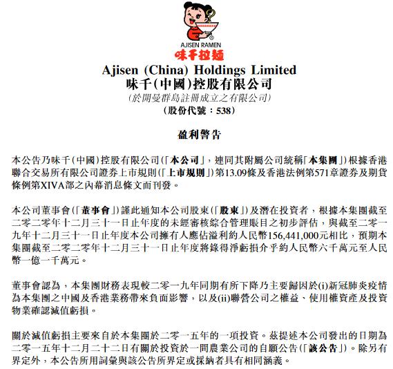 味千拉面董事会认为,2020年业绩表现较上一年同期有所下降主要是受疫情影响,且投资江苏鸿轩的6100万已确认为减值亏损,大幅拖累了2020年度的业绩。