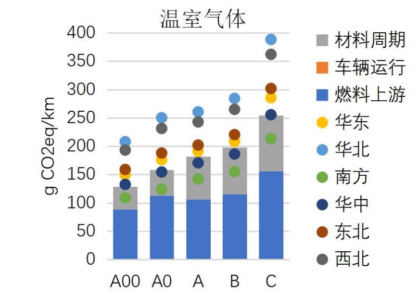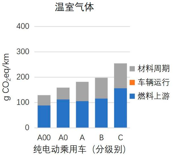 上述《汽车生命周期温室气体及大气污染物排放评价报告2019》表明,假定所有车辆均在全国平均电力情况下生产、组装、使用,从车辆级别角度来看,无论是对于汽油乘用车或是纯电动乘用车,A00级别车辆均具有最小的温室气体排放因子,随着车辆级别的增加(从A00至C),全生命周期的温室气体排放水平依次增加,这是由于较高级别车辆的燃料周期和材料周期温室气体排放水平均高于低级别的车辆。
