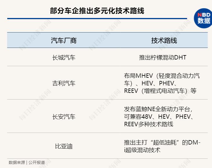 各大车企并没有把筹码完全押在纯电动技术路线上,而是纷纷加码多元化技术路径