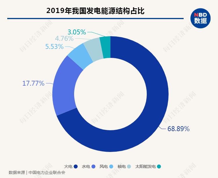 2019年我国火电发电50465亿千瓦时,其中煤电45538亿千瓦时,火电发电占比近七成