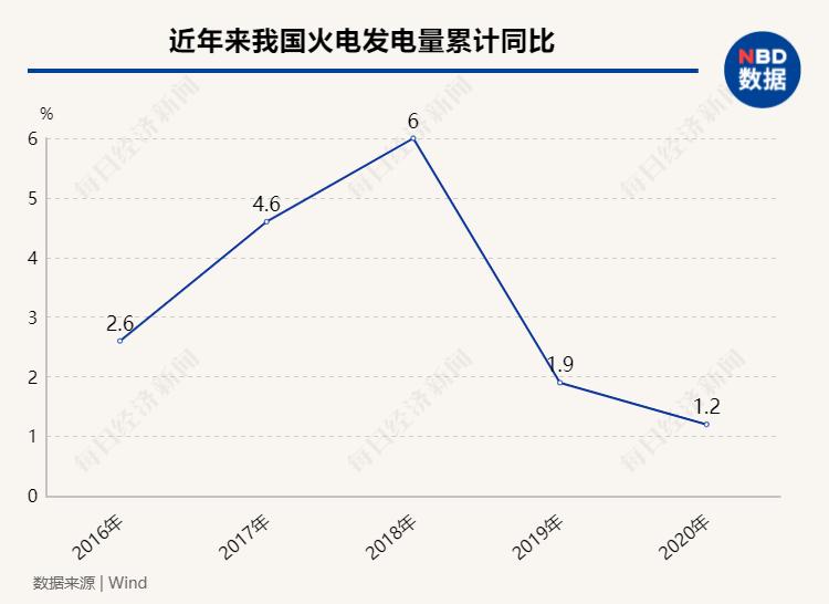 但根据wind数据,2020年12月,火电发电累计同比增长1.2%,已经比2019年同期下降0.7个百分点,比2018年同期更是下降4.8个百分点。