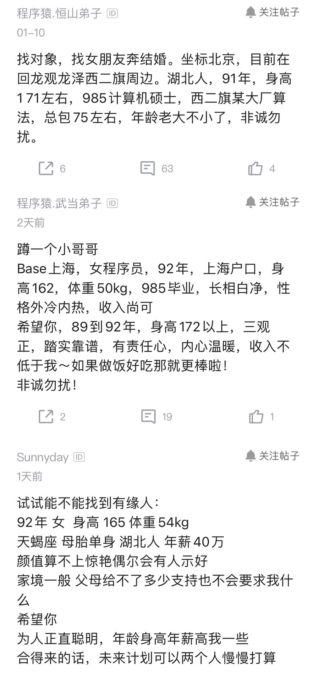 很快我就收到了回复,有人说我没有写清自己的条件,我只好又补充了一条评论,“1990年,身高160,颜值中等偏上,本科985,目前在某新媒体公司当主管,年薪税前30左右,目前无房无车无户口。”