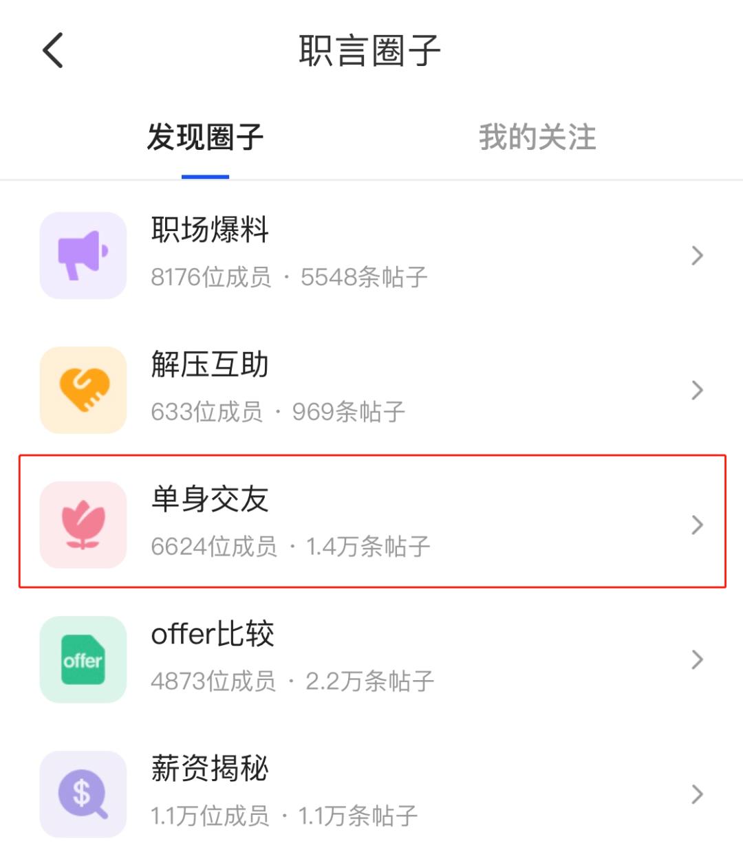 但最近一年,脉脉的相亲功能快速生长,已经有反客为主的趋势了。脉脉的职言圈子里,除了行业圈,最火的几个圈子就是#薪资揭秘#、#职场爆料#和#单身交友#。