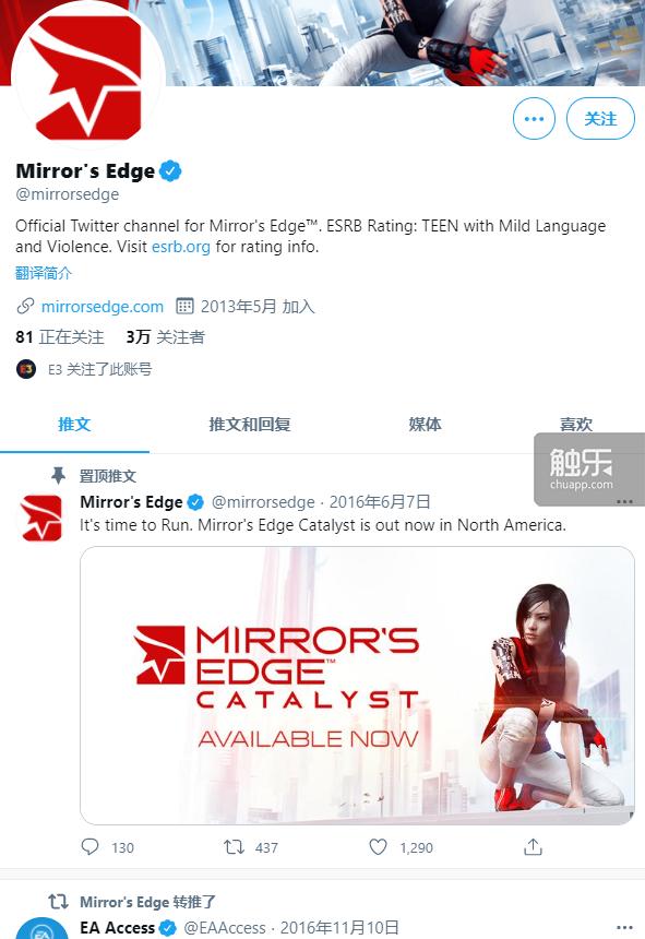 “镜之边缘”系列的官推注册于2013年,正好是《镜之边缘:催化剂》刚刚透露出消息的时候。它坚持运营到了2016年游戏成功发售,在发售半年后……悄无声息地停止运营了。可能EA只把推特看作一个售前宣发的工具?我不知道,但短命的“镜之边缘”官推确实让我心有戚戚,就像对这个短命的游戏系列一样——说它短命也有点不太合适,毕竟初代可是2009年发售的游戏。但时隔7年的续作——EA说不是续作,是“重启”,但重启之后也没看到什么后续来。总之,它没有达到人们的预期。即便是喜欢这个系列的粉丝,也会挑出几个《镜之边缘:催化剂》没做好的地方,一些大毛病。
