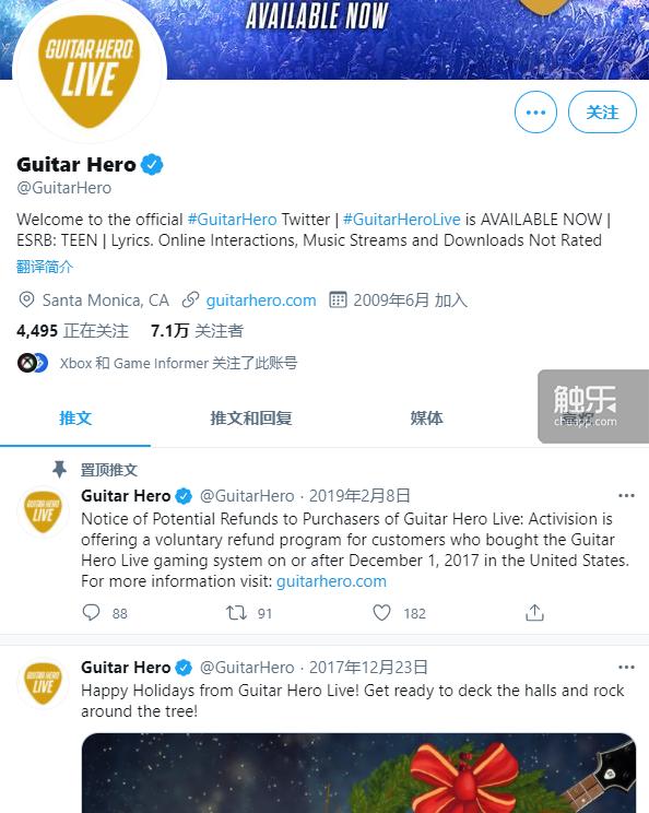 这条退款公告是系列官推的最后一条推文,也是它2019年的唯一一条推文。再上一条来自于2017年,官推会在每个假期发一些促销消息,比如说:“感恩节了,快来买《吉他英雄:现场》和配套外设吧!”但也仅限于此了。