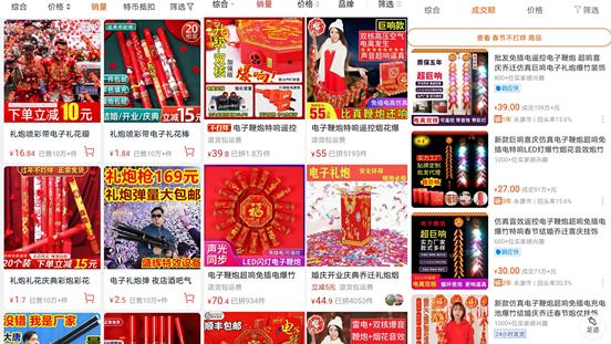 相似的一幕还发生在电商平台上。16.8元的电子烟花在淘宝特价版“已售10万+件”。在1688搜索电子烟花,排在第一的厂家成交额超过111万。拼多多的电子烟花被藏在喜庆用品店里,同样显示“已拼10万+件”。