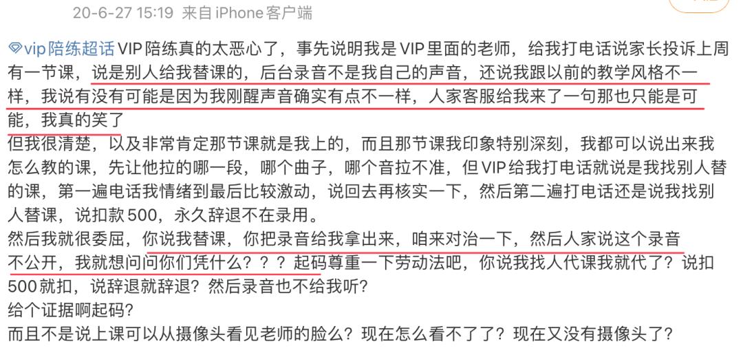 其一是对陪练老师的不平等待遇。2019年,VIP陪练曾因降低课时费和苛刻的要求被陪练老师送上微博热搜。其初级、中级和高级兼职陪练老师的课时费分别是20元、26元和31元(一个课时50分钟),然而陪练老师却很容易遭受十倍甚至二十倍于课时费的罚款。